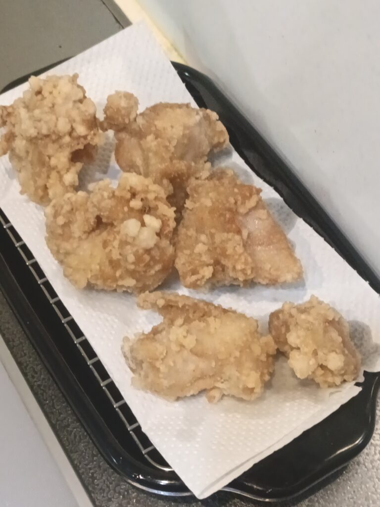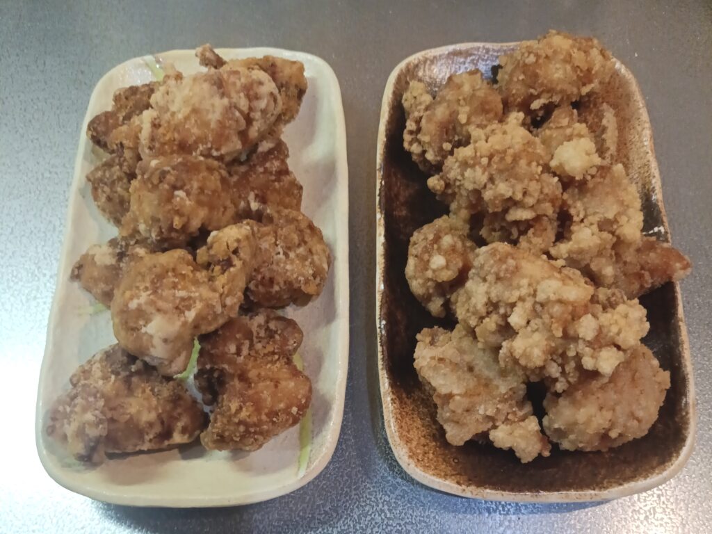 右はアラ還親父の定番しょうゆとお酒、片栗粉100%なので衣もカリッとおいしくできました。