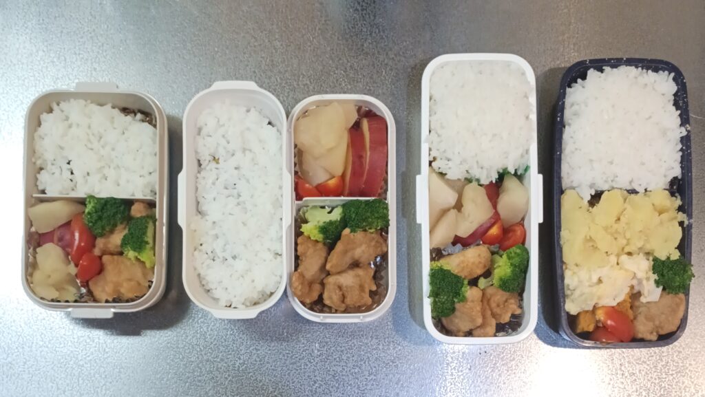 左から女子高生の娘、、社会人の息子、お母さん、アラ還親父のお弁当です。