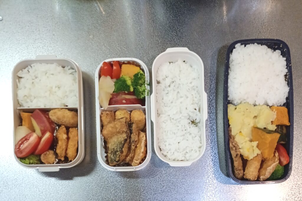 左から女子高生の娘、、社会人の息子、アラ還親父のお弁当です。