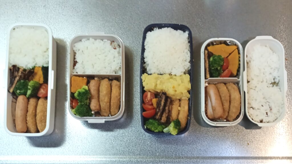 左からお母さん、女子高生の娘、、アラ還親父、社会人の息子のお弁当です。