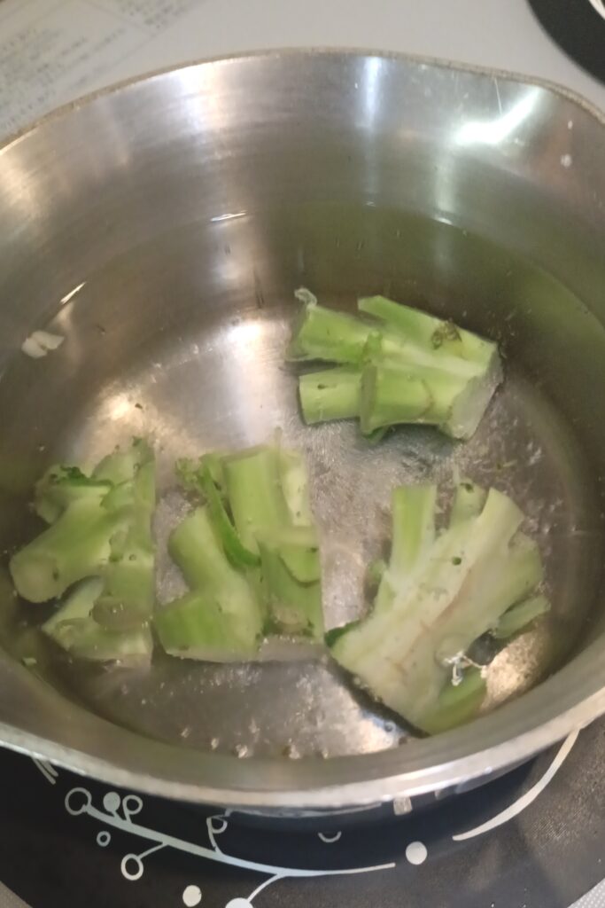 ブロッコリーの芯を同時に茹でてもいいのですが暑くて大変なので順番に茹でてます。