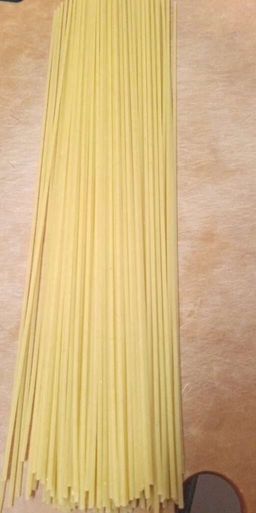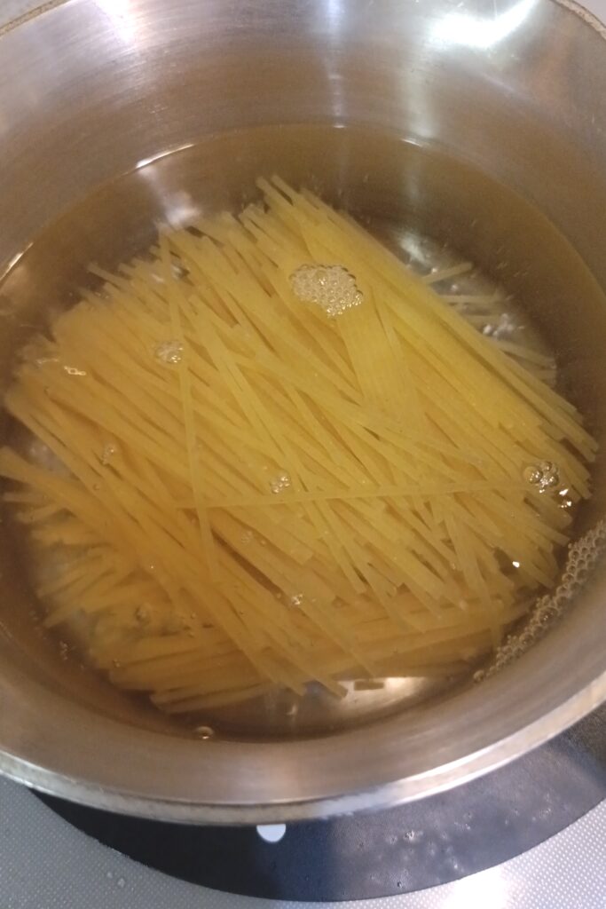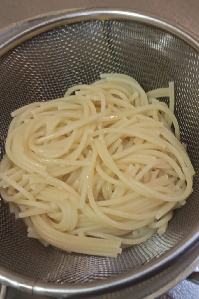 スパゲッティーが茹で上がったらざるに揚げオリーブオイルをかけて混ぜ合わせます。
