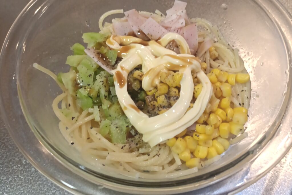 スパゲッティーをボールに入れブロッコリーの芯、食べやすい大きさに切ったハム、解凍した冷凍コーンを入れ